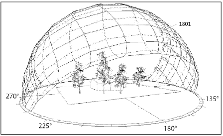 이러한 작업을 거처 솔라 사이트의 하나 이상의 포인트들에 상응하는 하나 이상의 태양 경로가 반구형의 뷰쉐드인 3차원 모델로 생성되는데, 바로 〈Fig. 20〉의 2001의 반구형의 뷰쉐드가 포인트 1에 상응하고, 2002가 포인트 2에, 2003이 포인트 3에 해당하는 반구형의 뷰쉐드이다. 이때 반구형의 뷰쉐드는 하나 이상의 태양경로들인 2004를 모두 종합한 것이다.