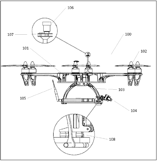 〈Fig.3〉은 UAV 100의 측면도로, 104는 하나 이상의 3차원 센서들이 101의 프레임에, 공기나 공간 위에 떠 있는 구조물의 동요에 관계없이 자이로스코프와 같은 물체의 기본 틀이 기울어져도 자이로스코프를 정립 상태로 유지해주는 지지장치인 짐벌 어셈블리(gimbal assembly)를 통해 부착되어 있다. 그리고 하나 이상의 3차원 센서들은 하나 이상의 진동완충기인 방진구(vibration dampener) 위에 탑재되어 있다. 106은 렌즈로 107의 방진구 위에 탑재되어 있는데, 이는 102의 프로펠러보다 위로 뻗어있다.