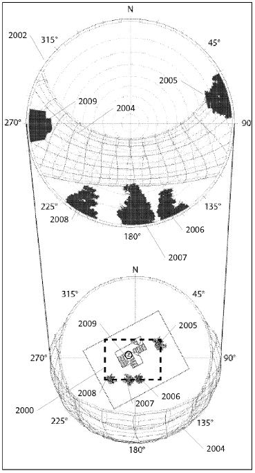 이러한 태양의 경과들은 솔라 사이트의 다양한 포인트들에 빛을 쪼이는 태양의 위치들과 상응하는데, 하루 종일, 혹은 일년의 몇 일 혹은 몇 달을 추적할 수 있다. 따라서 태양의 경과는 전체 캘린더 일년(entire calendar year) 동안의 움직임이 포함될 수 있는데, 바로 〈Fig. 18A〉의 1801의 3차원 구조가 일년 동안의 태양 경과이고, 〈Fig. 18B〉는 1801의 3차원 태양경과가 1802의 3차원 솔라 사이트에 삽입된 것이다.