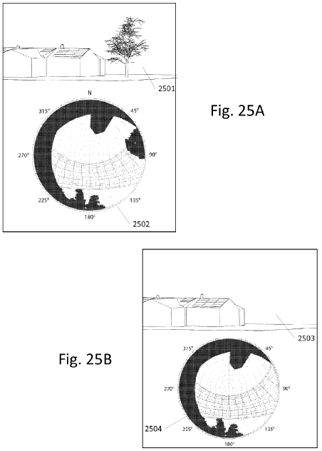 자 그 다음은 이를 바탕으로 솔라 에너지 수확(solar collection estimates)을 예측하는 과정으로 들어간다. 우선, 태양경로들과 포인트들 사이에 있는 밝혀진 환경 구조들은 이를 예측하는데 사용된다. Fig.25A~25B는 이를 설명하는 그림으로, 2501의 나무가 2502의 반구형의 뷰쉐드에서 보면, 태양경로의 빛을 차단하는 장애물이다. 그래서 2503과 같이 나무를 제거하고 그대신 빈자리로 처리하여, 2504의 반구형의 뷰쉐드를 업데이트 하는 것이다. 사용자는 실제로 나무를 베어내지 않고 나무를 3차원 모델에서 제거함으로써 에너지를 많이 수확할 수 있는 방법을 모색하는 것이다.