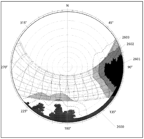 자 이번에는 밝혀진 주변 환경, 예를 들어 나무가 10년간 성장했을 때 혹은 20년간 성장했을 때 태양경로를 차단해 에너지 수확이 얼마나 감소되는 가를 예측하는 것이다. Fig.26의 2600은 반구형의 뷰쉐드인데, 2601의 나무가 그림자를 드리우는 것으로 윤곽이 나와 있고, 2602는 10년 성장했을 때의 그림자, 2603은 20년 성장했을 때의 그림자이다.