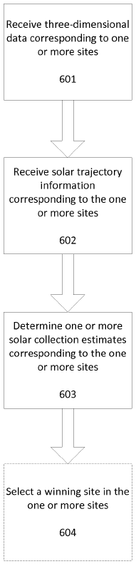 〈Fig.6〉은 태양광 발전 설치를 위한 후보 사이트 평가의 방법을 스텝(step)의 그림으로 나타낸 것이다. 스텝 601에서는 하나 이상의 후보 사이트와 상응하는 3차원 데이터를 받는다. 만약 두 개의 사이트가 있다면, 두 개의 일련의 3차원 데이터들을 받는데, 각각의 일련의 3차원 데이터는 각각 사이트와 대응되는 것이다.