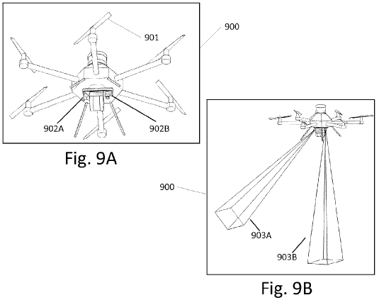 〈Fig.9A〉와 〈Fig.9B〉는 또 다른 UAV 900이 솔라 사이트 평가를 하는데, 902A와 902B는 카메라이고, 903A와 903B는 카메라가 잡은 이미지들이다. 이미지들은 시간 경과 이미지들(time-lapse images)이다. 카메라 대신 3차원 센서가 될 수도 있고 깊이 센서(depth sensor)가 될 수도 있다.
