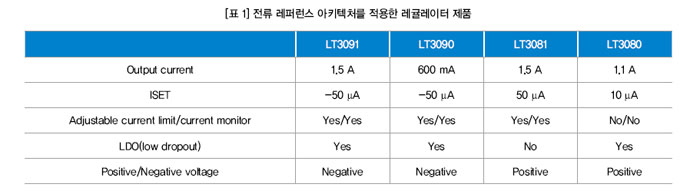〈표 1〉은 이 아키텍처를 적용한 디바이스 제품들을 요약하고 있다. LT3091은 바로 이 제품군으로 새롭게 추가된 1.5 A LDO(low dropout) 네거티브(negative)의 선형 레귤레이터로서, 전류 한계를 조절 가능하며 전류 모니터링 기능을 제공한다. LT3091은 이 제품군의 또 다른 네거티브의 선형 레귤레이터 제품인 LT3090과 같으면서 다만 전류정격이 LT3090의 두 배 이상이다.
