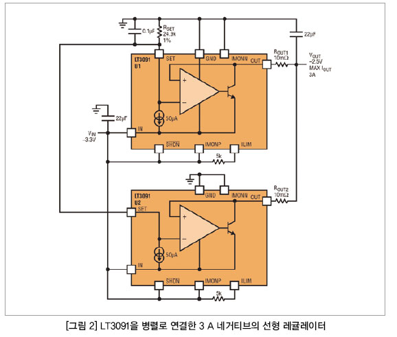 〈그림 2〉는 2개 LT3091을 병렬로 연결해 3 A 출력을 제공하는 것을 보여준다. 그러면 설정 저항 RSET을 통해 두배의 설정 전류가 흐른다. 그러므로 출력은 100 μA × RSET이다. 10 mΩ 출력저항 ROUT1,2를 사용해서 최대 전류로 안정화 할 수 있다. 병렬로 연결할 수 있는 디바이스 수에 한계가 없이 더 높은 전류를 제공할 수 있다.