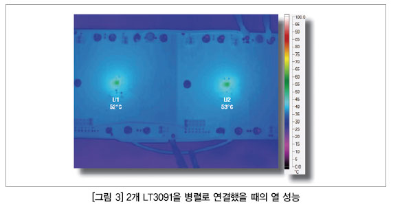 〈그림 3〉은 〈그림 2〉의 회로로 열분포를 보여준다. U1과 U2가 비슷한 온도에 도달하고 있으므로 전류를 균등하게 공유하고 있다는 것을 알 수 있다.