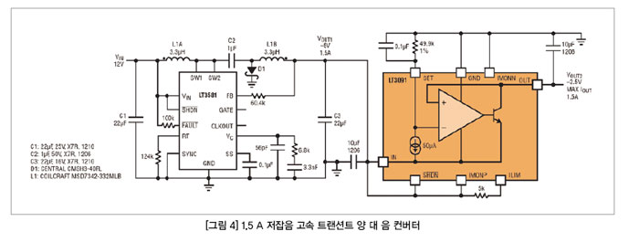 반전 컨버터는 포지티브의 입력으로 부터 네거티브의 전압을 발생시키며 출력 리플이 낮다. 여기에다 LT3091와 같은 고대역폭 LDO를 결합함으로써 전체적인 컨버터가 트랜션트 응답이 매우 빠르고 잡음을 더욱 낮출 수 있다.