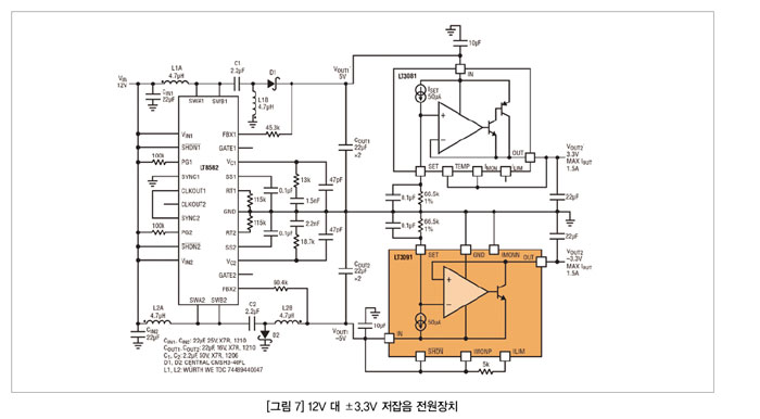 〈그림 7〉은 LT8582, LT3081, LT3091을 사용한 1.5 A 12 V 대 ±3.3 V 저잡음 전원장치를 보여준다.