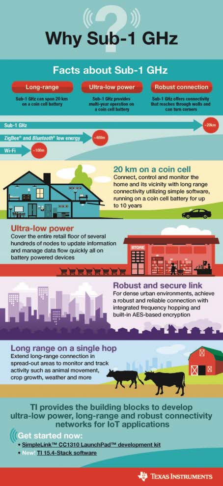 Sub-1 GHz는 블루투스, 지그비, 와이파이와 비교해서 단순한 소프트웨어를 사용해서 집안 전체를 커버할 수 있는 유일한 기술이다. 그러므로 전반적으로 전력 소모를 낮출 수 있다.