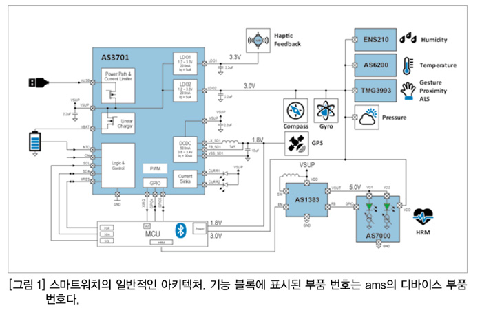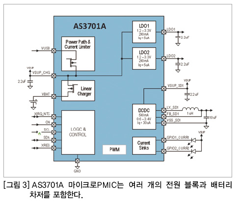 여러 개의 디스크리트 전원 소자를 사용해서는 그처럼 소형 풋프린트를 달성할 수 없다는 것은 확실하다. 〈그림 1〉이 새로운 스마트워치나 피트니스 밴드 디자인의 기능을 거의 근접하게 표현하고 있다고 가정하면, AS3701과 같은 마이크로 PMIC는 거의 꼭 맞는 솔루션을 제공할 것이다.