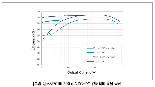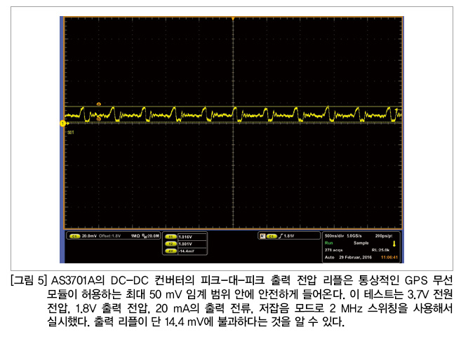 GPS 모듈은 피크-대-피크 전압 리플 잡음에 특히 민감하다. 50 mV가 통상적으로 허용할 수 있는 최대치다. AS3701A의 DC-DC 컨버터는 높은 안전성 마진을 제공한다(그림 5).