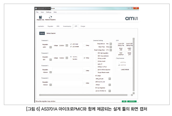 첫 번째는 단일 전원 디바이스를 사용하기 때문에 어셈블리가 용이하다는 것이다. 마이크로 PMIC의 또 다른 이점은 손쉽게 설계할 수 있다는 것이다. 〈그림 6〉은 AS3701 평가 보드와 함께 제공되는 GUI의 화면 캡처다. 이 화면에서 볼수 있듯이 스텝다운 레귤레이터와 LDO에 대해서 다양한 출력 전압을 간편하게 프로그램할 수 있다.