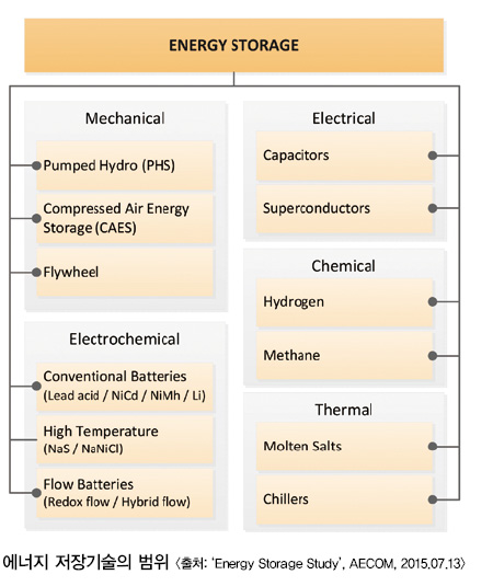 ESS 기술에는 여러 가지가 있지만, 크게 물리적·기계적 저장 기술, 전기 저장 기술로 구분할 수 있다. 물리적·기계적 저장 기술에는 양수발전, 압축 공기 저장, 플라이휠, 태양광, 풍력, 수소 에너지 등이 있으며, 전기 저장 기술에는 나트륨황(NaS) 전지, 유동 전지(플로 전지), 리튬이온전지 등이 있다.