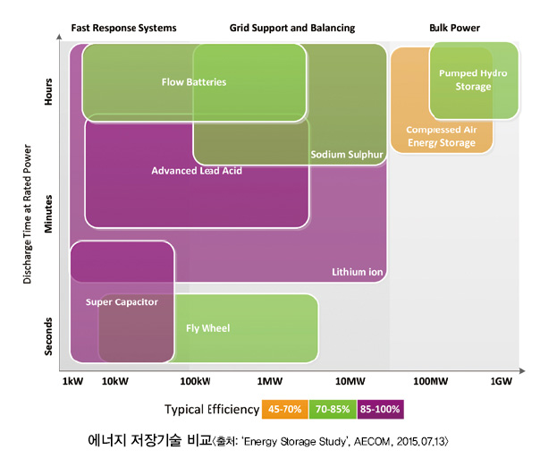 살펴본 바와 같이 태양광발전이나 풍력발전 등 신재생에너지의 도입 확대에 따라 에너지 저장 기술에 대한 수요가 확대돼 왔다. 압축 공기 및 플라이휠, 수소에너지 등 새로운 에너지 저장 수단의 검토도 활발해지고 있다. 또한 축전지 분야에서는 NaS 전지, 레독스 흐름 전지, 리튬이온 전지의 도입 사례 역시 증가하는 추세다.