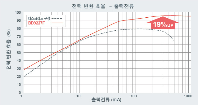 BD9227F는 디스크리트 구성에 비해 모든 부하 영역에서 고효율을 실현한다. 예를 들어 300 mA 부하 시에는 전력 변환 효율을 약 19% 향상시킬 수 있다. 고부하 시에는 그 차이가 더욱 현저하게 나타난다.