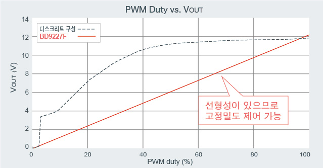 기존의 디스크리트 구성 시에는 PWM 단자에 입력된 펄스의 Duty에 대해 출력전압의 선형성이 없어, 모터의 회전 속도를 고정밀도로 제어하기 어려웠다.
