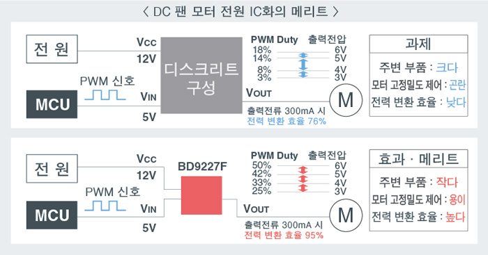 이에 따라, 큰 코일 및 출력 콘덴서 등 주변 부품의 소형화를 통해 부품 점유 면적을 기존 구성 대비 약 75% 삭감함과 동시에, 전력 변환 효율도 19% 향상(출력전류 300 mA 시)할 수 있어, DC 팬 모터를 탑재하는 애플리케이션의 고정밀도화와 소형화, 전력 변환 효율 향상에 기여한다.
