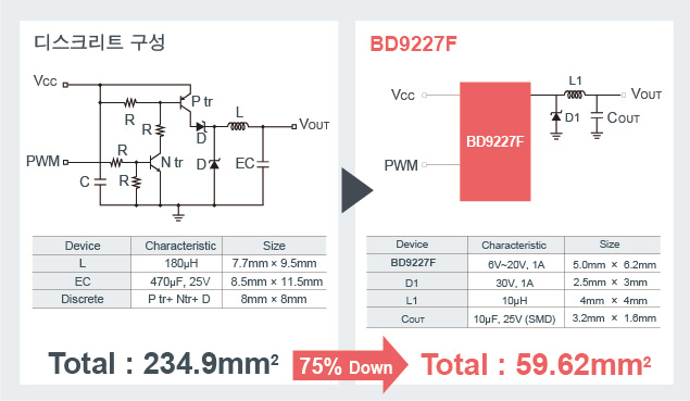 BD9227F는 IC 내의 주파수 제어를 통해 동작 주파수 1MHz의 고주파 구동이 가능하기 때문에, 큰 코일 및 출력 콘덴서 등 주변 부품을 소형화화여, 기존 구성 대비 점유 면적을 약 75% 삭감할 수 있다.