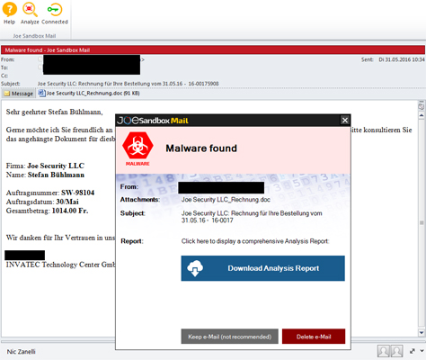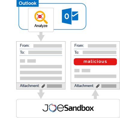 마이크로소프트 아웃룩(Microsoft Outlook)에 적용(add-in)시키는 방식의 ‘조샌드박스 메일’은 ‘조샌드박스’와 연동해 이메일 첨부파일의 악성 컨텐츠를 스캔하는 제품이다. 간단한 클릭만으로 심층적인 멀웨어 분석 엔진에 샘플 파일을 전송할 수 있으며, 즉각적인 분석을 통해 감염된 이메일을 식별할 수 있다.
