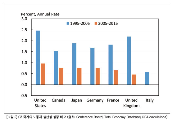 미국을 비롯한 많은 국가에서 투자 감소로 경기 둔화가 나타나 총 요소 생산성 증가(기술 변화에 영향을 받는 구성 요소)의 둔화 감소 역시 중요해졌다. 이는 실질 임금 성장 둔화에 기여했으며, 만약 둔화세가 지속되면 이는 생활수준 향상의 지연으로 이어지게 된다.