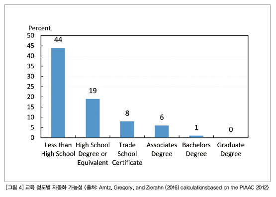 또한 OECD의 연구에 따르면, 교육 수준이 낮은 근로자는 고학력자보다 자동화로 대체될 가능성이 더 높다. 게다가 OECD의 연구에 참여한 연구원들은 고등학교 학위를 받지 못한 미국 내 근로자의 44%가 고도의 자동화로 대체될 직업에 종사하고 있으며, 학사 학위 이상의 경우에는 1%만이 자동화로 대체될 직업을 보유하고 있다고 추정했다.