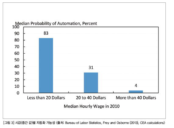 전체적인 고용효과 규모 이외에 분배의 영향에 대한 이해도 중요하다. 미 대통령경제자문위원회(CEA)는 임금에 의해 직업 순위를 나열한 프레이와 오스본의 분석에 따라 자동화의 압력을 받는 직업은 시급 20달러 미만의 83%, 시급 20~40달러 사이의 31%, 시급 40달러 이상의 4%에 해당할 것이라고 분석했다.