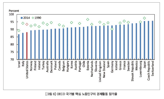지난 40년간, 다른 주요 선진국들은 미국과 유사하게 기술 변화를 경험했다. 하지만 미국의 소득 불평등은 크게 증가했고 전체적인 불평등 지수도 높아졌다. 더군다나 대부분의 다른 선진국들이 핵심 노동인구의 경제활동 참가가 감소하는 동안 다른 선진국들보다 미국은 더 가파르게 감소했다.