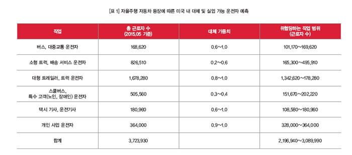현재의 AI 기술을 기반으로 몇 가지 특별한 예측은 가능하다. 예를 들어, 운전 관련 직업과 가사도우미는 상대적으로 고학력의 교육을 받지 않아도 되는 직업이다. 컴퓨터 비전과 관련한 기술의 진보는 운전자를 필요로 하지 않는 완전 자율주행 자동차의 실현 가능성을 높여 운전 관련 전문직에 종사하는 일부 노동자를 대체할 가능성이 높아졌다.