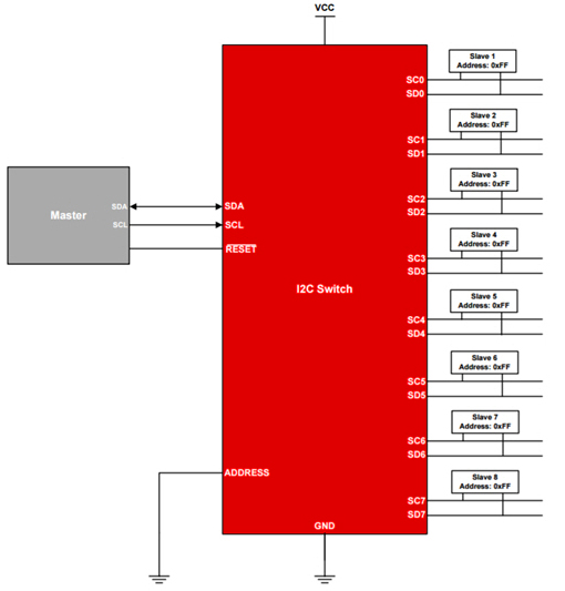I2C 스위치는 두 가지 문제를 해결할 수 있다. 첫 번째 문제는 동일 버스 상의 두 디바이스가 동일한 어드레스일 때 흔히 발생되는 어드레스 충돌에 관련된 것이다. 예를 들어서 어떤 시스템이 동일 I2C 버스 상으로 2개의 온도 센서와 2개의 습도 센서를 사용하고 이들 모든 센서가 어드레스가 0xFF라고 했을 때, 그림 3에서 같이 I2C 스위치를 사용함으로써 한 번에 한 센서로 전환할 수 있다. 두 번째 문제는 전력 소모에 관한 것이다. I2C 스위치는 한 번에 I2C 버스의 한 부분만 구동할 수 있으므로 버스의 사용되지 않는 부분은 전력이 낮아진다.