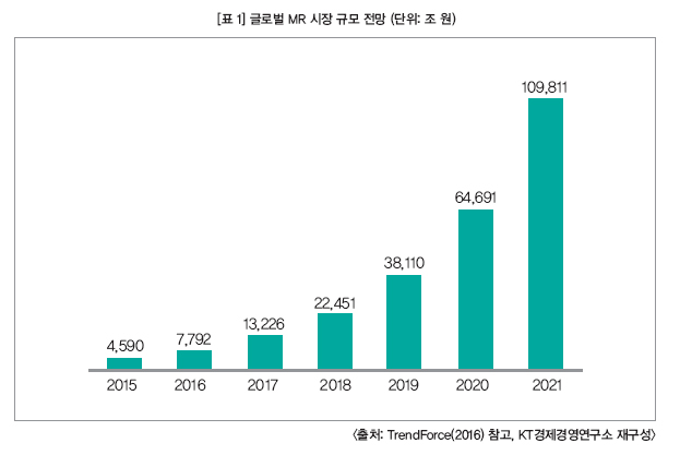 IndustryArc와 KT경제경영연구소에 따르면, 전 세계 MR 시장은 2015년 4,580억 원에서 2021년 1조 980억 원으로 약 두 배 이상 성장할 것으로 전망된다. VR이나 AR에 비해 상대적으로 적은 규모일 수 있으나, 2017년 이후 출시될 MR 전용 HMD(Head Mounted Disply) 기기나 콘텐츠의 기대감으로 성장은 가속화될 것으로 보인다.
