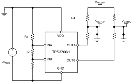 그림 2에서 모니터링된 전압(VMON)은 접지에 대한 음전압이다. 양전압과 동일한 방법으로 R1, R2, R3를 사용해서 과전압 및 저전압 제한을 프로그램할 수 있다. TPS3700 또는 TPS3701의 개방 드레인 출력은 VDD에 종속되지 않는다. 즉, VPULLUP이 양전압이 될 수 있고, 양의 접지 기준 로직 전압은 어떠한 마이크로 컨트롤러 또는 프로세서와도 인터페이스할 수 있다.