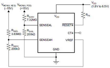 앞서 설명한 기법을 사용해서 음전압을 감지하기 위해서는 출력에 추가 다이오드와 저항이 필요하다. 더 적은 부품을 사용해서 음 전압을 감지할 수 있는 또 다른 기법은 양전압을 저항 분할기 전압으로 시프트함으로써 나누어진 임계 전압이 접지에 대해서 양의 값이 되도록 하는 것이다. 4채널 TPS386000 감시기는 저항 체인을 연결할 수 있는 레퍼런스 전압을 제공함으로써 이를 쉽게 한다. (그림 3에서 참조).