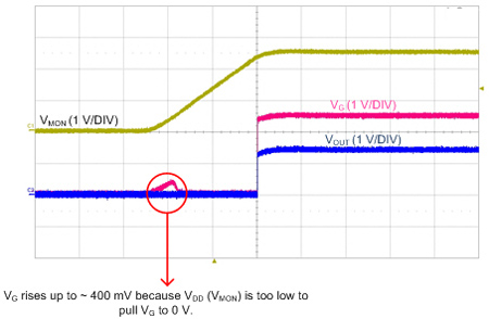 그림 4에서는 TPS3890의 정상 출력을 VG로 표시하고 있다. VMON(모니터링 되는 전압)이 상승하면 VG의 전압 역시 짧게 약 0.5V 상승한다. 소스-팔로워(Source-Follower)로 구성된 표준 JFET을 추가함으로써, 소스에서의 전압이 VG의 전압에서 JFET의 임계 전압을 뺀 것을 추적 할 수 있다. 그럼으로써 VG와 VOUT 사이에 약 1V 강하가 발생되고 VG에서 0.5V 상승이 제거된다. 그림 5는 TPS3890 의 출력에서 JFET을 사용한 결과를 보여준다.