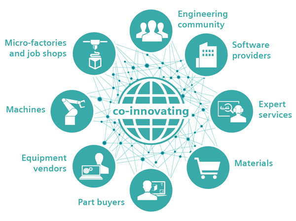 지멘스는 적층제조에 대한 전문 지식과 최신 기술에 대해 전 세계 어디에서나, 필요에 따라 접근하고자 하는 기업들의 니즈에 대처할 수 있는 부품 제조 플랫폼을 제공할 계획이다. 이 플랫폼은 제품 디자이너, 잡 숍(Job Shops: 주문 생산), 부품 구매자, 3D 프린터 OEM, 자재 공급 업체, 전문 서비스 제공 업체, 마이크로 팩토리 등 다양한 분야의 우수한 회원들로 구성된 온라인 에코시스템을 구축한다. 회원들은 다른 회원들과 즉각적으로 연락하여 적층제조용 최신 소프트웨어 툴을 활용해 제품의 공동 혁신을 시작할 수 있다.