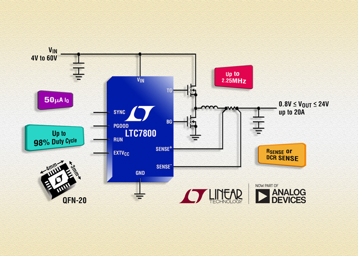 LTC7800은 높은 과도전압과 자동차 콜드 크랭크 상태 동안의 연속 동작으로부터 보호하고 다양한 입력 소스 및 배터리를 커버할 수 있도록 4~60V의 입력 공급 전압에서 동작하도록 되어 있다. 출력 전압은 최대 20A의 출력 전류에서 0.8~24V 범위 내로 설정이 가능하기 때문에 12V 또는 24V 자동차, 중장비, 산업 제어, 로보틱스 및 텔레콤 애플리케이션에 이상적으로 활용될 수 있다.