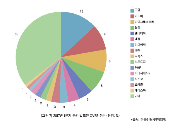 한국인터넷진흥원이 발표한 2017년 1분기 사이버 위협 동향 보고서에는 1분기 동안 발표된 취약점 평가 시스템(CVSS) v2 기준 7.0점 이상의 고위험군 보안 취약점은 671개였다. CVSS는 소프트웨어 보안 취약점을 1~10단계로 구분한 것으로 단계가 높을수록 위험도도 높아진다.