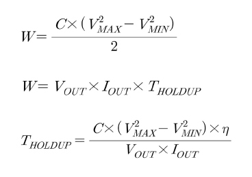 이 공식에서, C는 커패시턴스이고, VMAX와 VMIN은 각각 최대 및 최소 커패시턴스 전압이고, VOUT과 IOUT은 부하 전압 및 전류이고, TH는 홀드업 시간(다시 말해서 전원장치가 전원 중단 후에 출력 전압 레귤레이션을 유지할 수 있는 시간)이다.