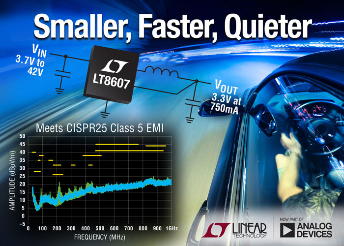 최근 리니어 테크놀로지를 인수한 아나로그 디바이스는 750 mA, 42V 입력의 동기식 스텝다운 스위칭 레귤레이터 신제품 LT8607을 출시했다. 신제품의 독창적인 동기식 정류 토폴로지는 2 MHz의 스위칭 주파수에서 93%의 변환 효율을 제공할 뿐 아니라, 설계자가 매우 컴팩트한 풋프린트의 솔루션을 사용하면서 AM 라디오 같이 잡음에 민감한 핵심 주파수 대역을 피할 수 있게 해준다.