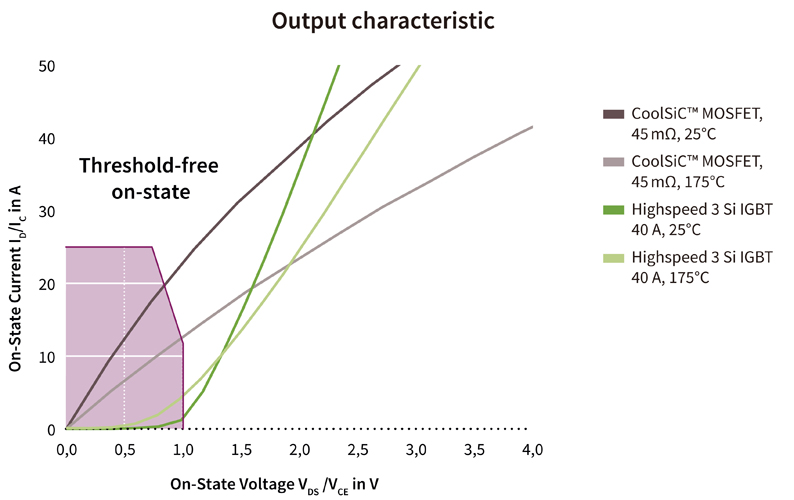 시스템 차원에서는 최소구동전압으로부터 자유로운 전도 동작 특성에 의해서 상당한 손실 감소가 가능하다. 많은 시스템이 대부분 시간을 부분 부하 조건으로 동작하므로 경쟁 관계인 표준 IGBT 기술과 비교해서 전도 손실이 훨씬 낮다. 5 kHz 미만의 아주 낮은 스위칭 주파수와 변화하지 않는 dv/dt 기울기로도, 바디 다이오드를 통합한 무릎 전압으로부터 자유로운 스위치가 동기 정류 모드로 현재 출시되어 있는 상용 IGBT 솔루션과 비교해서 총 손실을 50% 낮춘다는 것을 알 수 있다.