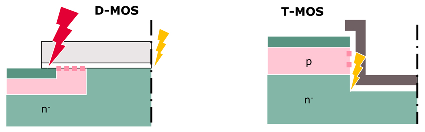 [그림 2] (왼쪽) 평면 MOSFET의 통상적인 구조로서, 산화막 전기장 스트레스와 관련해서 두 군데 민감한 부분을 알 수 있다. (오른쪽) 트렌치 MOSFET의 통상적인 구조로서, 트렌치 모서리 부분의 산화막 전기장 스트레스가 중요한 문제다.