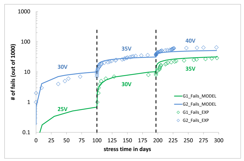 [그림 3] 장시간 테스트를 실시했다. 이 도표에서는 날짜에 따른 결함 횟수를 그리고 있다. 1,000개 디바이스로 이루어진 2개 그룹을 150℃로 일정한 게이트 전압 VGS를 사용해서 테스트했다. 100일째마다 VGS를 5V 높였다. 각각의 점이 결함을 나타낸다. 실선은 선형 E 모델을 사용한 예측을 나타낸다.