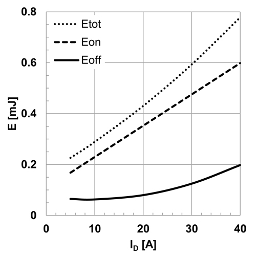 〈그림 4〉는 4핀 TO-247 패키지를 적용한 디바이스를 사용한 하프 브리지의 드레인 전류에 따른 스위칭 손실을 보여준다. 턴오프 에너지 Eoff가 부하 전류에 거의 종속적이지 않다는 것을 알 수 있다. 이것은 주로 커패시턴스가 지배적이기 때문이다. 반면에 턴온 에너지 Eon은 전류에 따라서 선형적으로 증가한다.