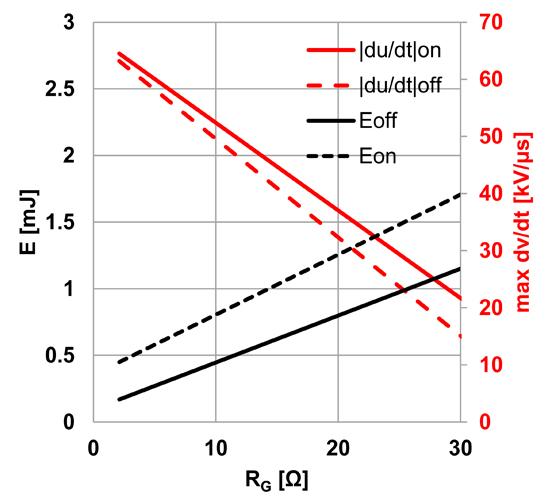 〈그림 5〉는 이 MOSFET이 게이트 저항 RG를 조절하는 것으로 전압 기울기 dv/dt를 손쉽게 조절할 수 있다는 것을 보여준다. 이 점은 특히 드라이브 애플리케이션에서 유용하다. 하지만 전압 기울기 dv/dt를 낮추면 대신에 스위칭 손실이 높아진다.