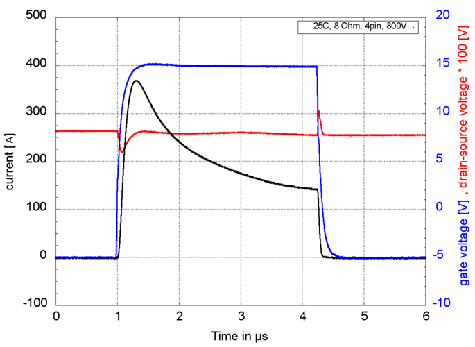 보통의 DMOS 동작과 달리 전달 특성을 보면 VGS=12V에서 이미 교차점이 나타난다. 12V를 넘으면 전류가 온도에 따라서 감소한다. 이렇게 되면 단락 회로 이벤트 시에 포화 전류를 제한하기에 유용하다.
