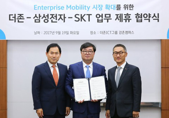 더존비즈온(대표 김용우)이 9월 19일 더존ICT그룹 강촌캠퍼스에서 삼성전자, SK텔레콤과 함께 엔터프라이즈 모빌리티 사업에 관한 3자 간 양해각서(MOU)를 체결하고 시장 확대에 협력해 나가기로 했다고 밝혔다.