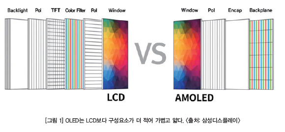 전력 소모가 더 낮다는 점 이외에도 OLED가 LCD보다 나은 점은 더 있다. 우선 백라이트가 없어 LCD보다 30% 정도 더 얇다. OLED로 스마트폰을 만들면 LCD를 사용한 것보다 더 얇은 스마트폰을 만들거나 그만큼 배터리를 추가할 수 있는 공간을 확보할 수 있다. OLED를 사용하면 전력 소비도 30% 낮추면서 배터리 양도 30% 정도 늘릴 수 있어 전체 스마트폰 사용 시간을 상당히 늘릴 수 있다.