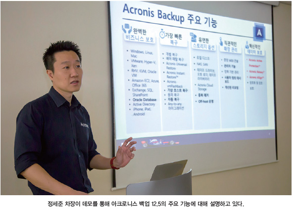이날 데모를 맡은 정세준 아크로니스코리아 차장은 “아크로니스 백업 12.5에서 눈여겨 볼 것은 아크로니스 액티브 프로텍션으로, 이는 아크로니스가 자체 개발한 휴리스틱 엔진을 기반으로 랜섬웨어 공격을 차단하고 데이터 복구가 가능한 기능”이라며, “수상한 작업 과정이 4~5회 이상 일어나면, 이를 감지한 후 차단은 물론이고 감염된 파일을 캐시를 활용해 복구할 수도 있다”고 말했다. 다만, 리눅스 버전에서는 액티브 프로텍션이 현재 지원되지 않으며, 향후 리눅스도 지원할 수 있도록 할 계획이다.