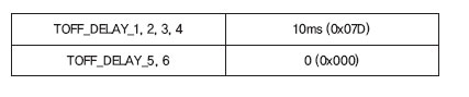두 번째 타이밍 파라미터는 TOFF_DELAY이다(지정된 시퀀스 순위에 이 시간만큼 기다렸다가 채널을 정지시킴). 이 파라미터는 TOFF_TIMERS_n 레지스터에 들어 있다. 80μs 간격으로 0μs부터 655ms까지의 값을 취할 수 있다.