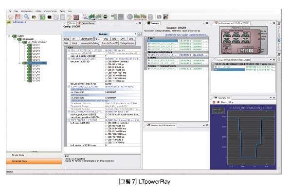 LTpowerPlay는 I2C 버스를 통해서 LTC2937과 인터페이스 할 수 있는 가장 손쉬운 방법이다. LTpowerPlay를 사용함으로써 LTC2937을 비롯한 많은 Linear Technology 디바이스의 내부 구성 및 상태 레지스터를 직관적이고, 유연하고, 포괄적으로 살펴볼 수 있다. 또한 LTpowerPlay는 MS 윈도우 PC 상에서 상세한 도움말 도큐멘테이션, 구성 파일, 그 밖의 지원을 제공한다. (그림 7)은 LTpowerPlay 툴을 디바이스로 연결한 화면을 보여준다.