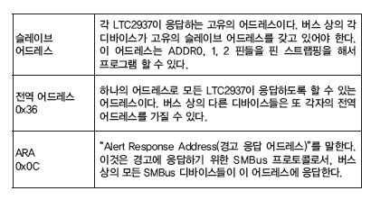 LTC2937은 I2C 버스를 통해서 지정된 어드레스에 응답할 수 있다. 이 버스로 다른 디바이스들이 사용된다면 LTC2937로 어떤 어드레스를 사용할지를 잘 고려해야 한다. 어드레스는 세 종류가 있다.